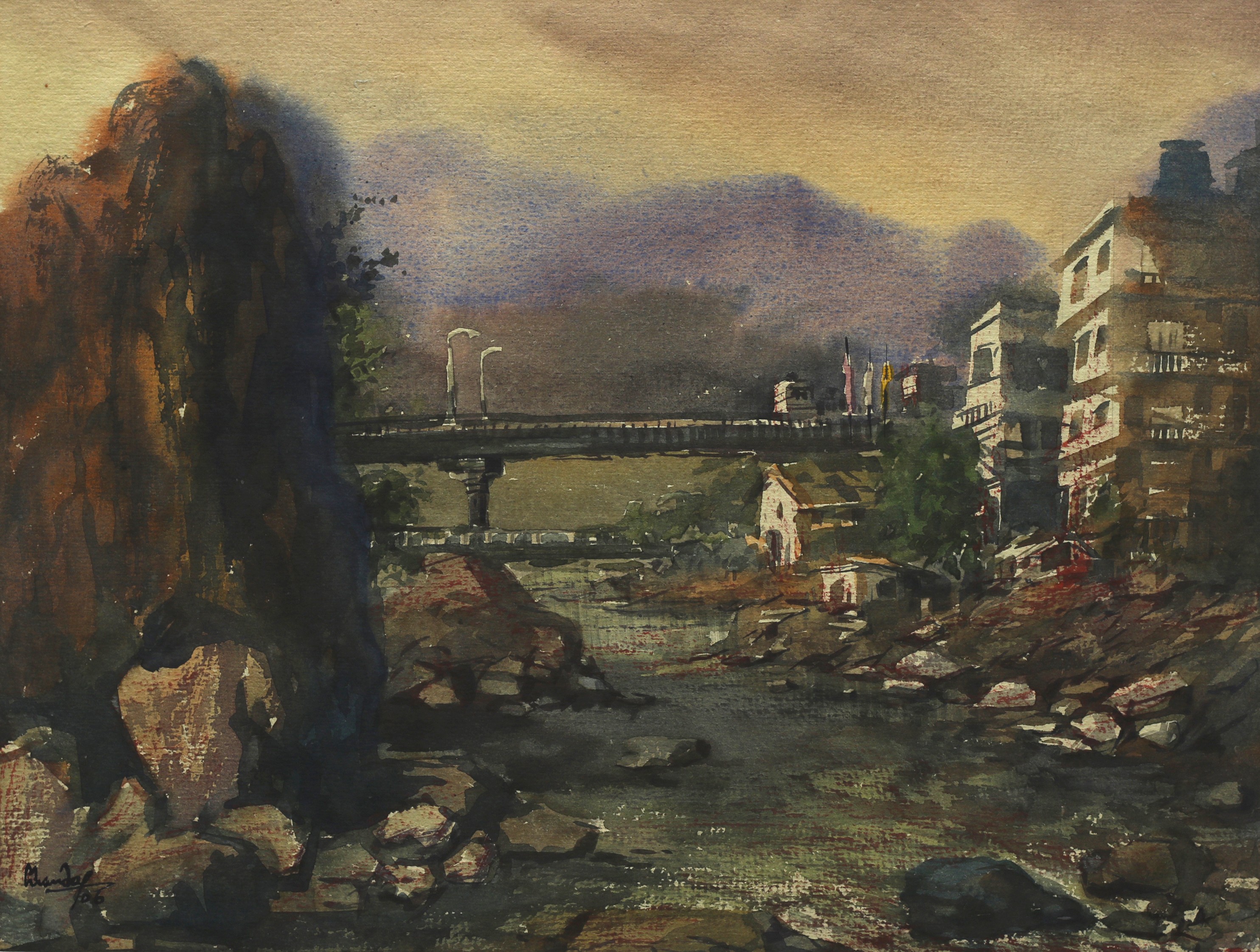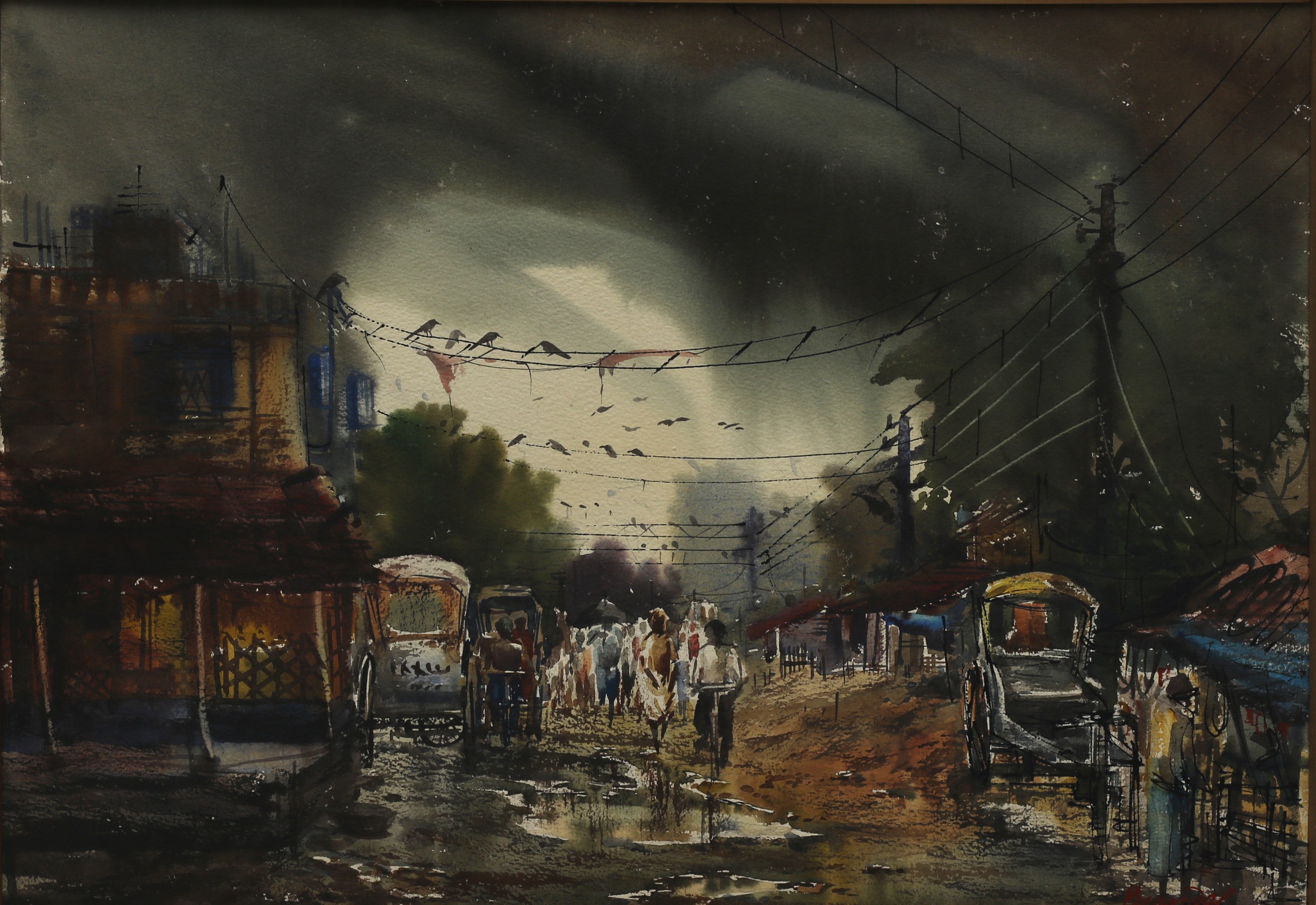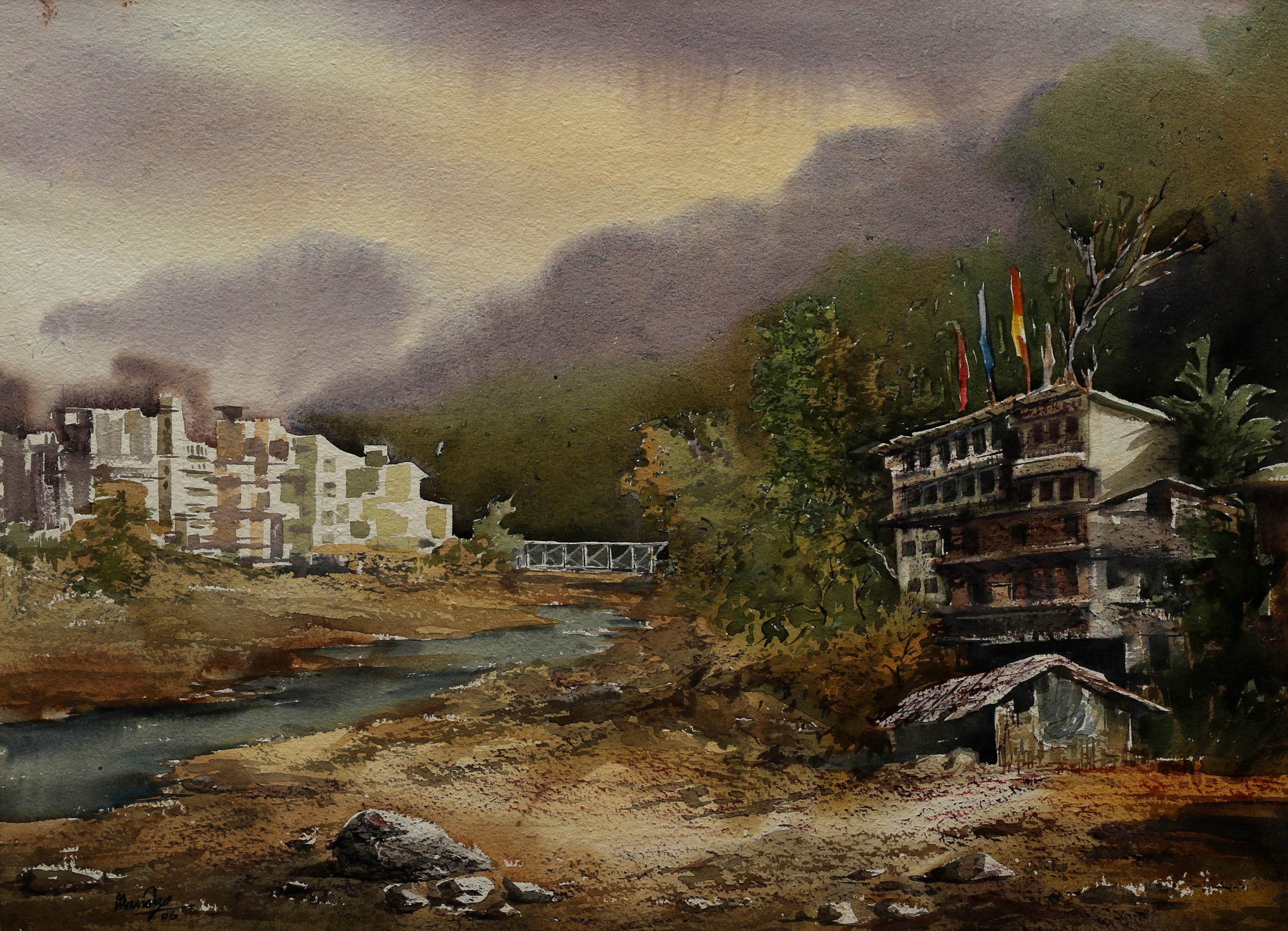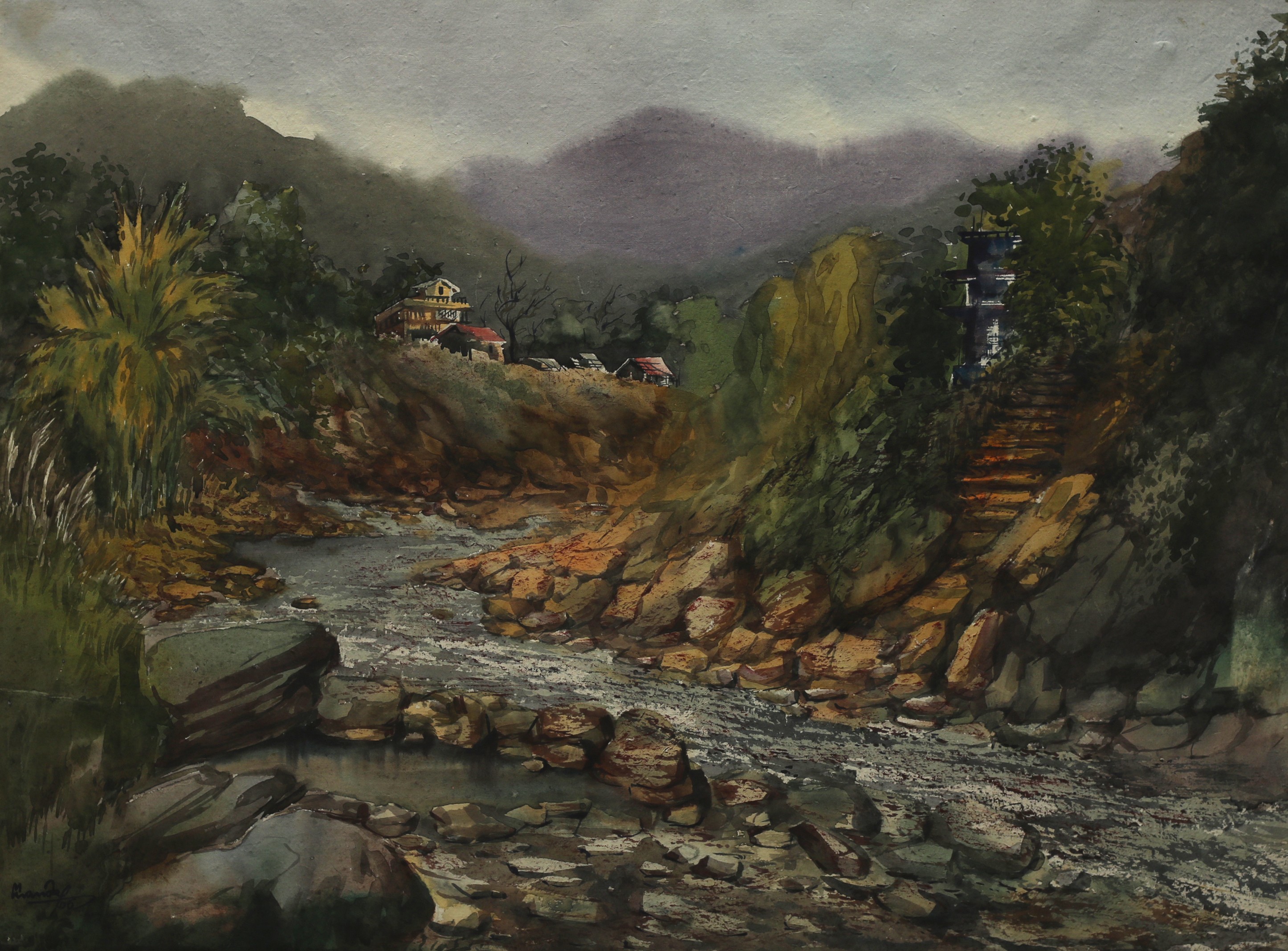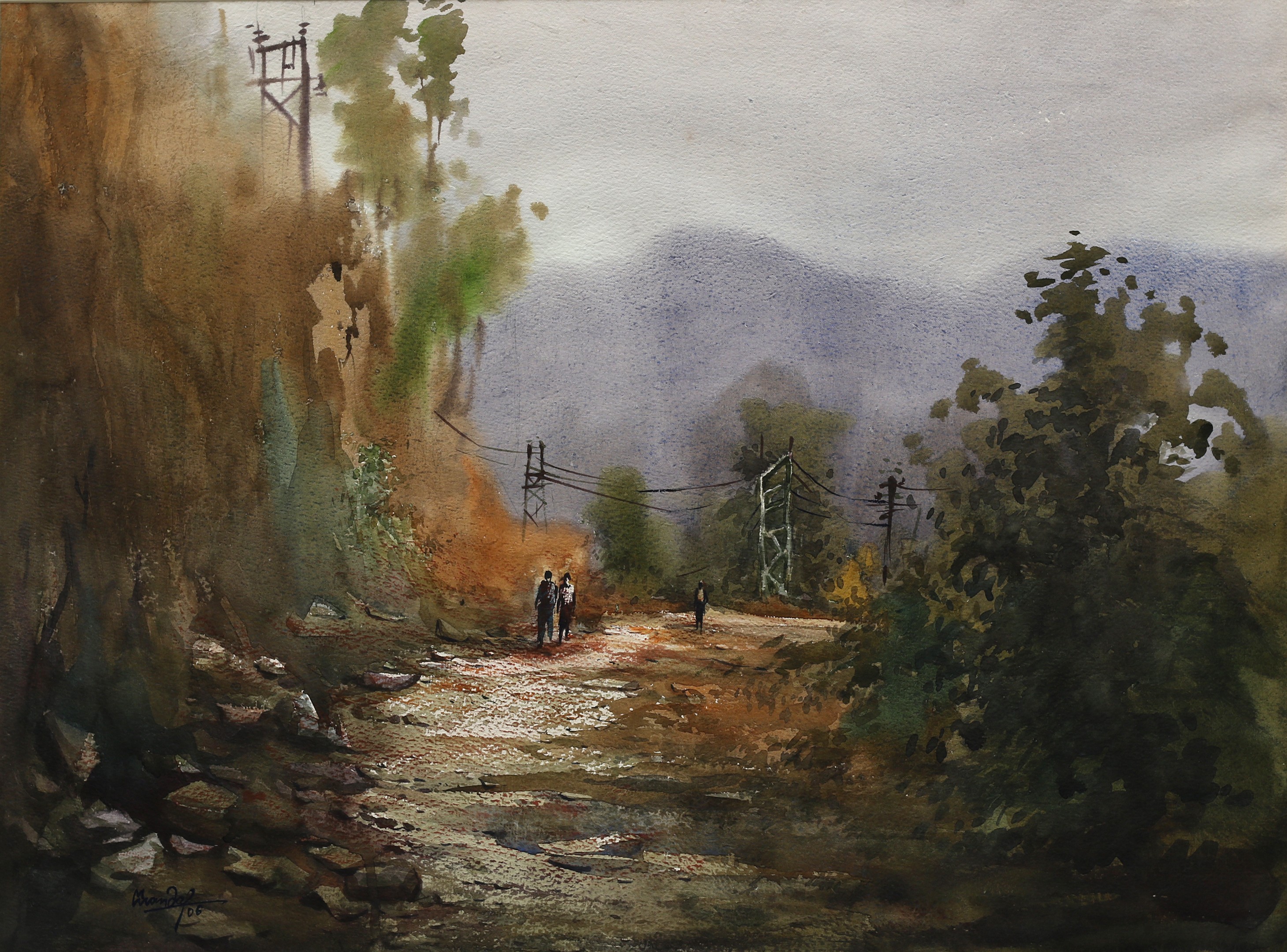 Mondal often paints in watercolour, freshness shown in his watercolour landscape paintings. Also painted the “Gangtok” series. His subjects are on day-today life of rural and urban areas. His compositions are calm and peaceful and soothing to the eyes.