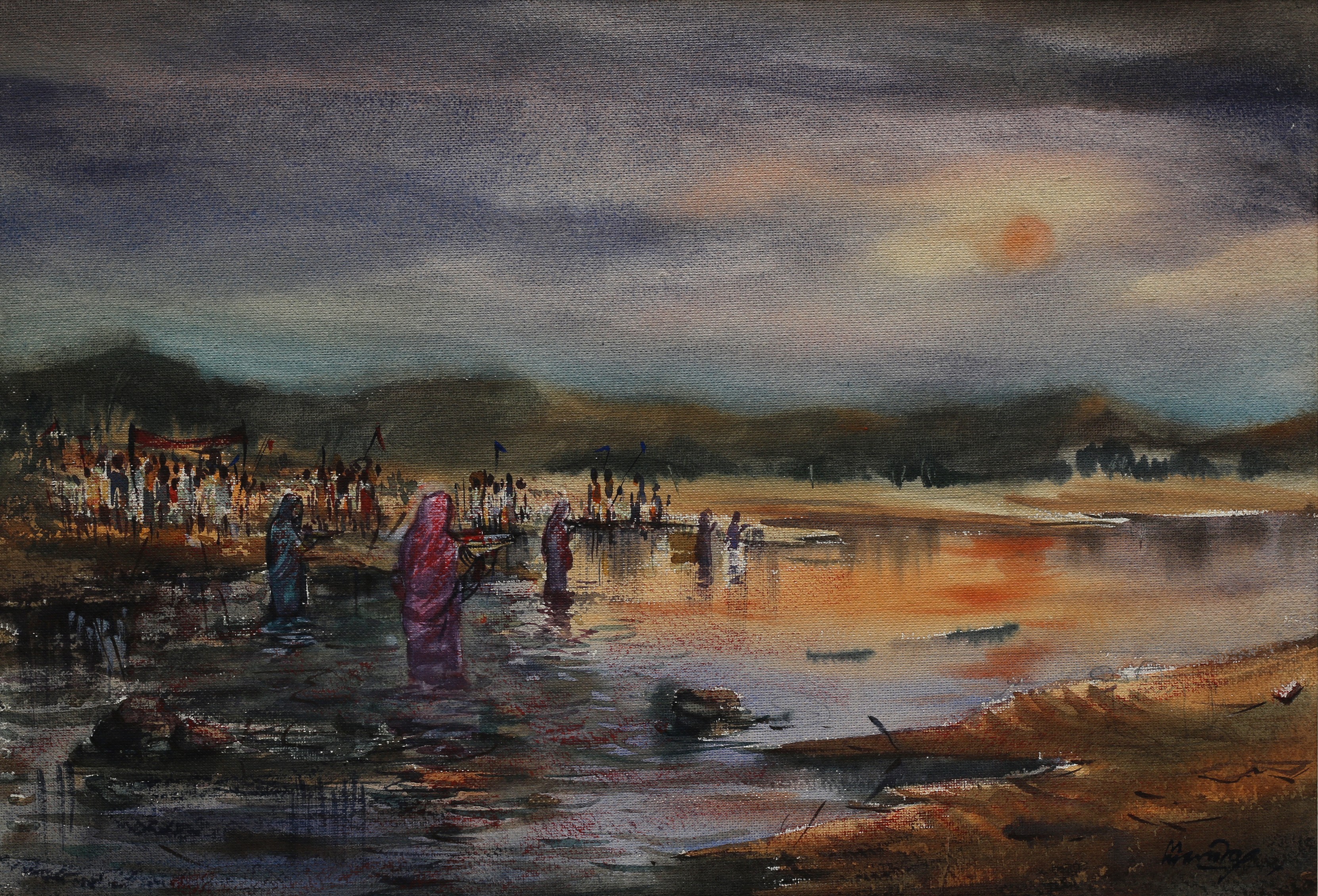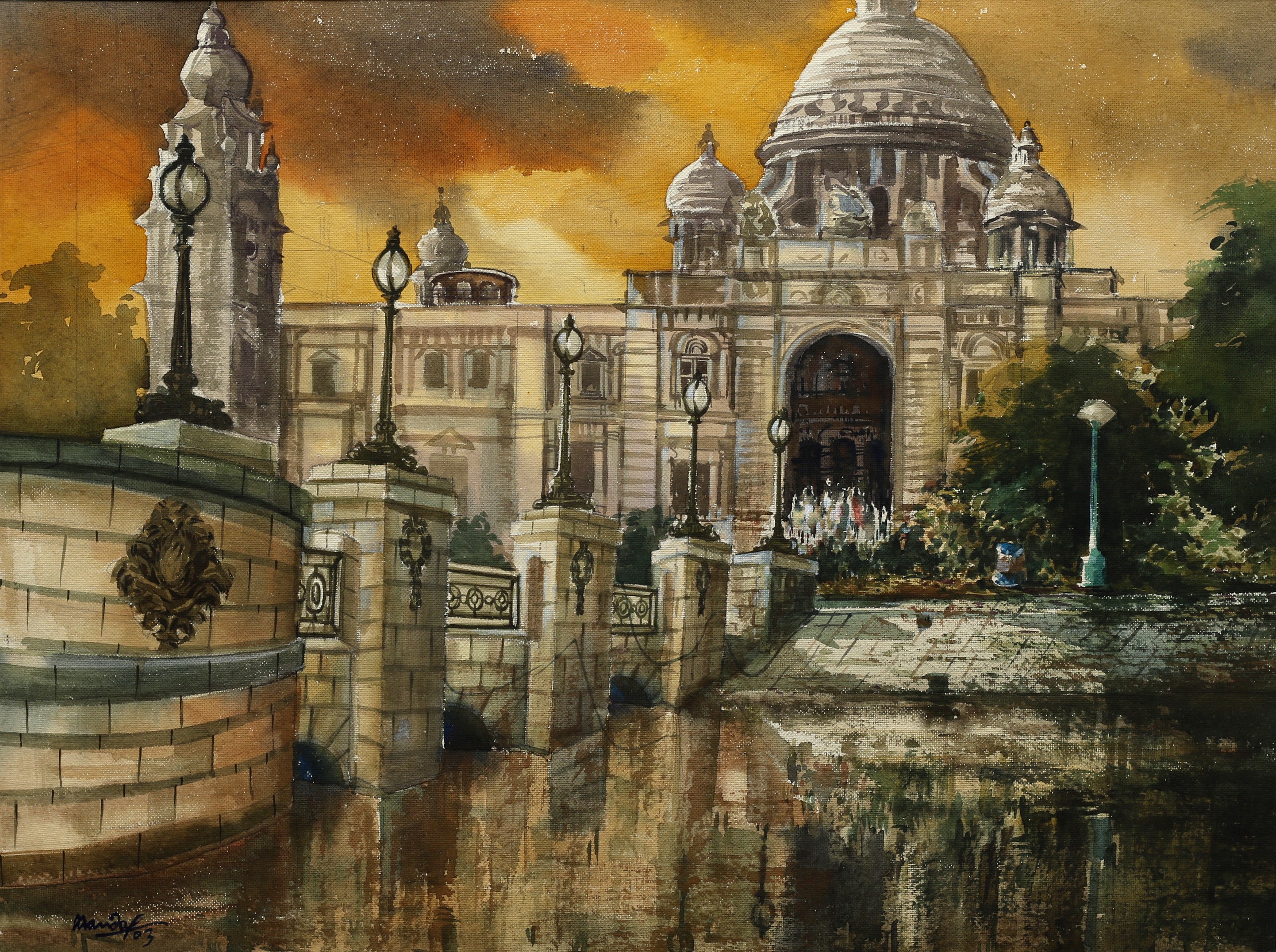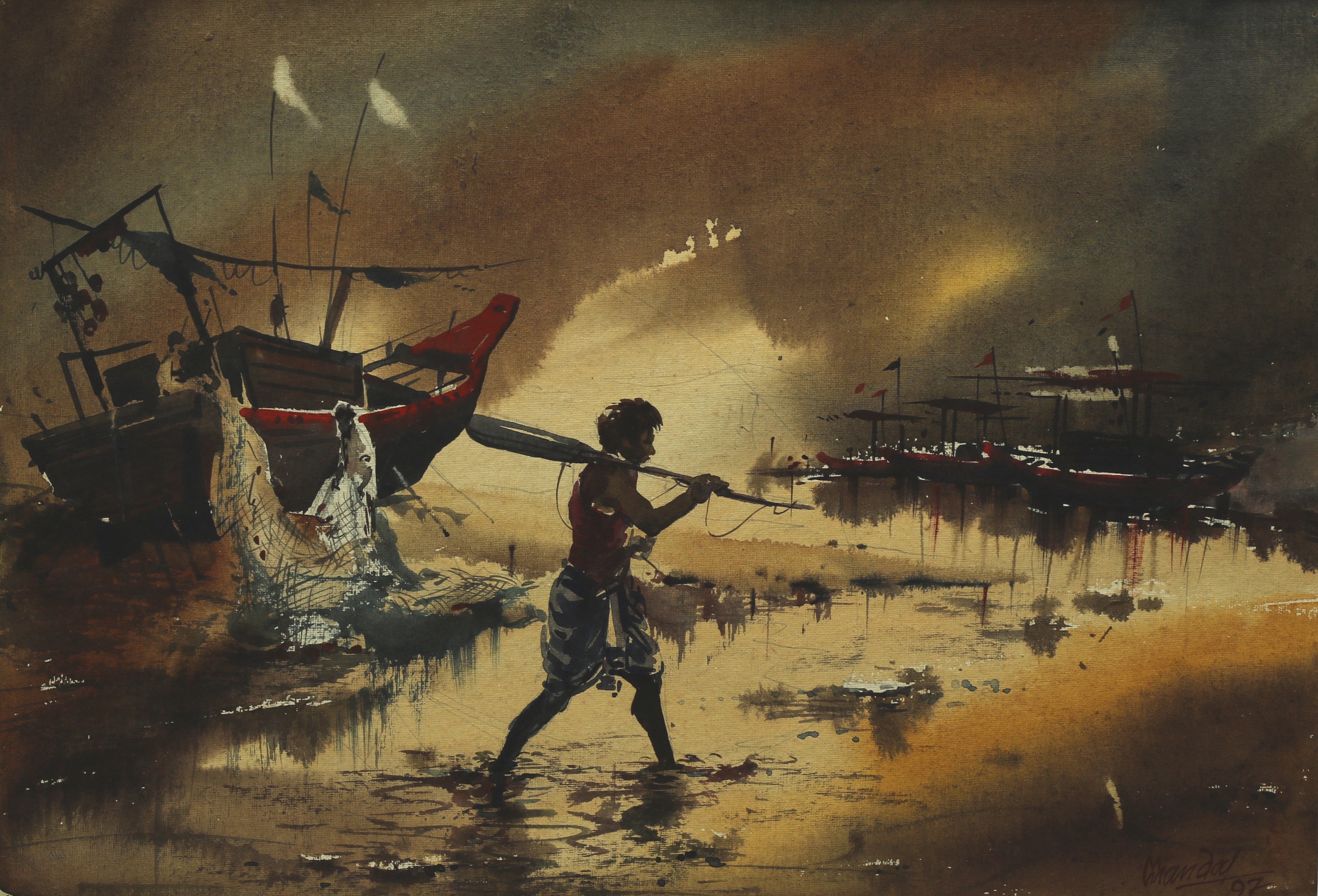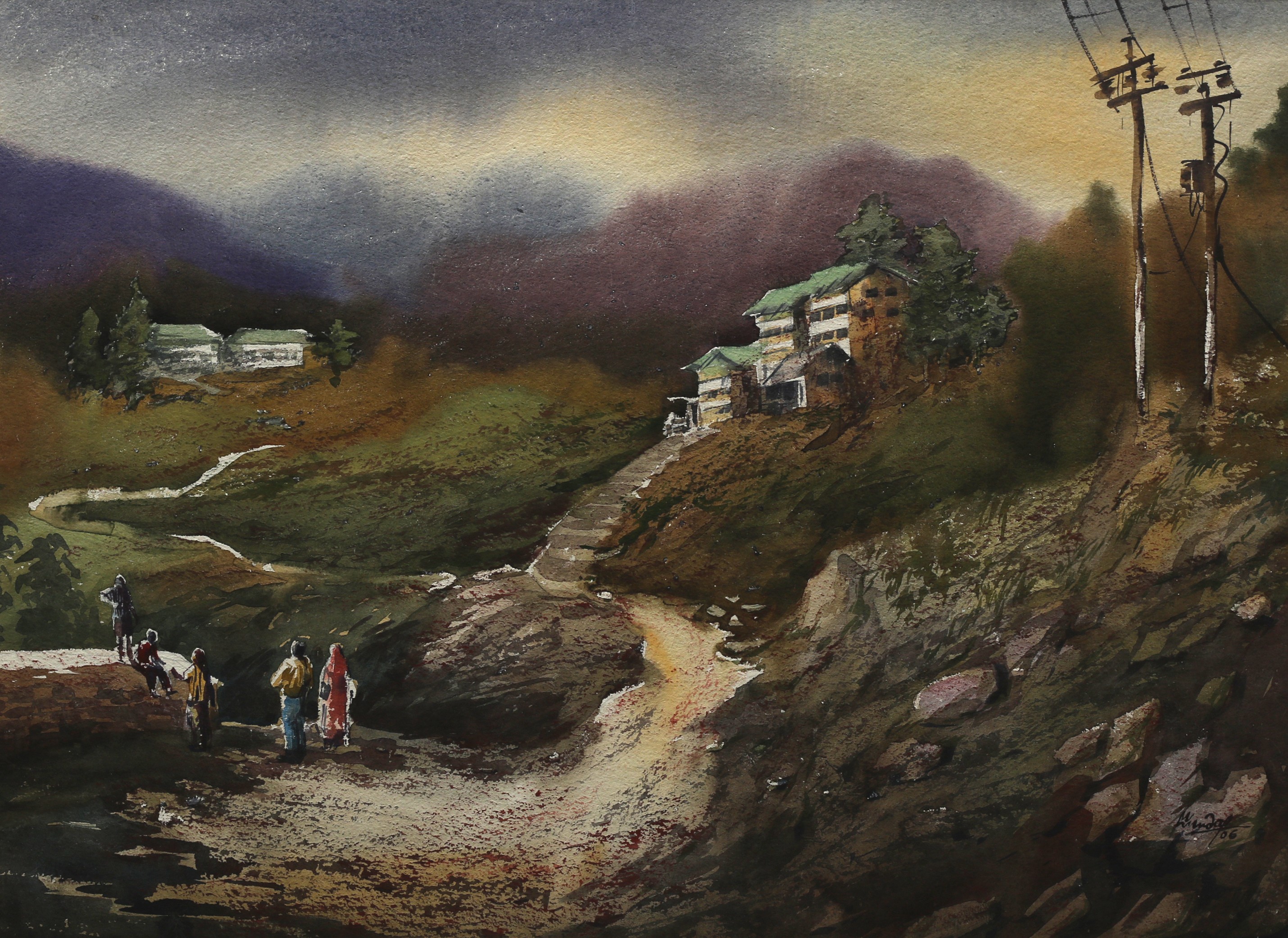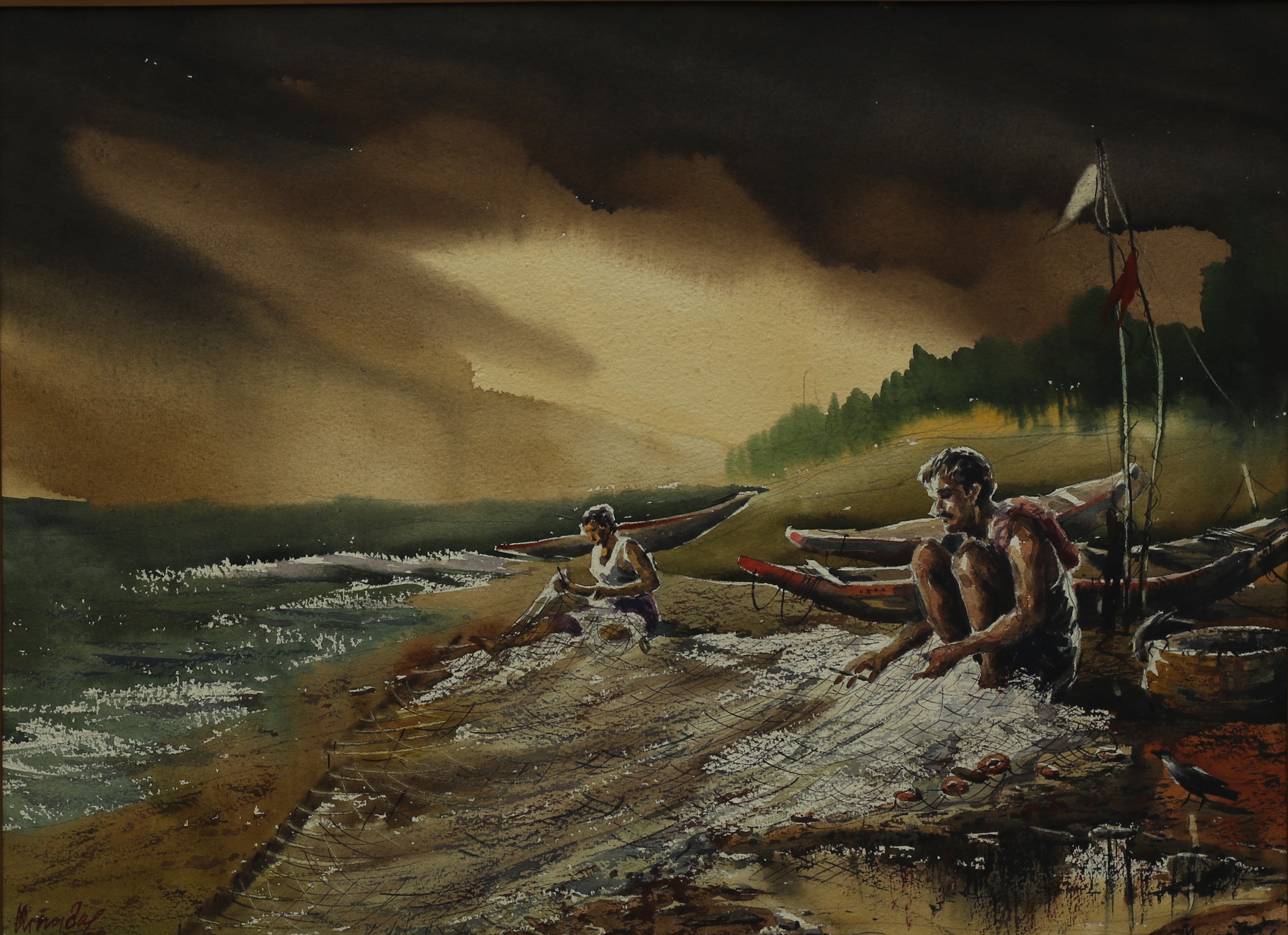 Mondal often paints in watercolour, freshness shown in his watercolour landscape paintings. Also painted the “Gangtok” series. His subjects are on day-today life of rural and urban areas. His compositions are calm and peaceful and soothing to the eyes.
