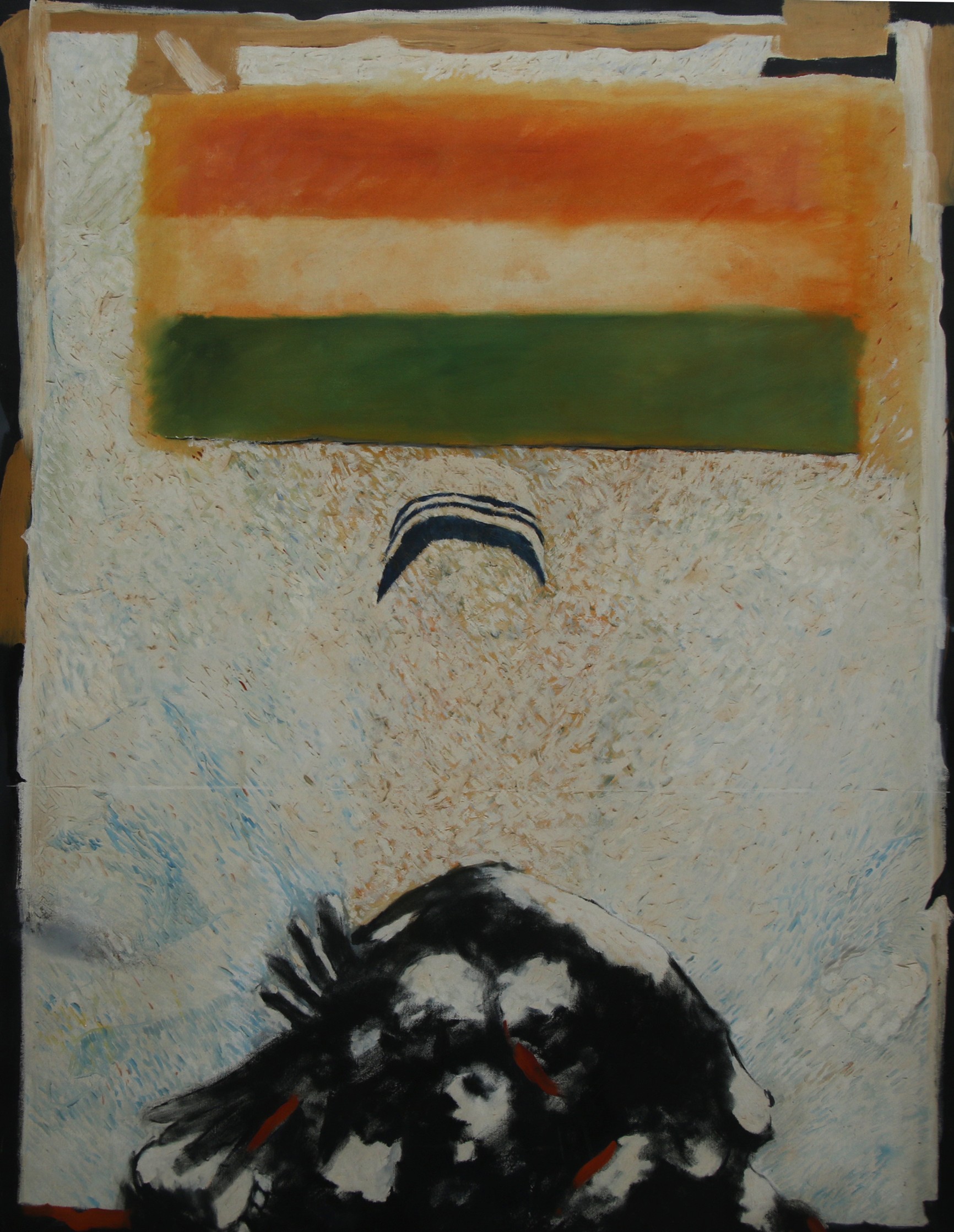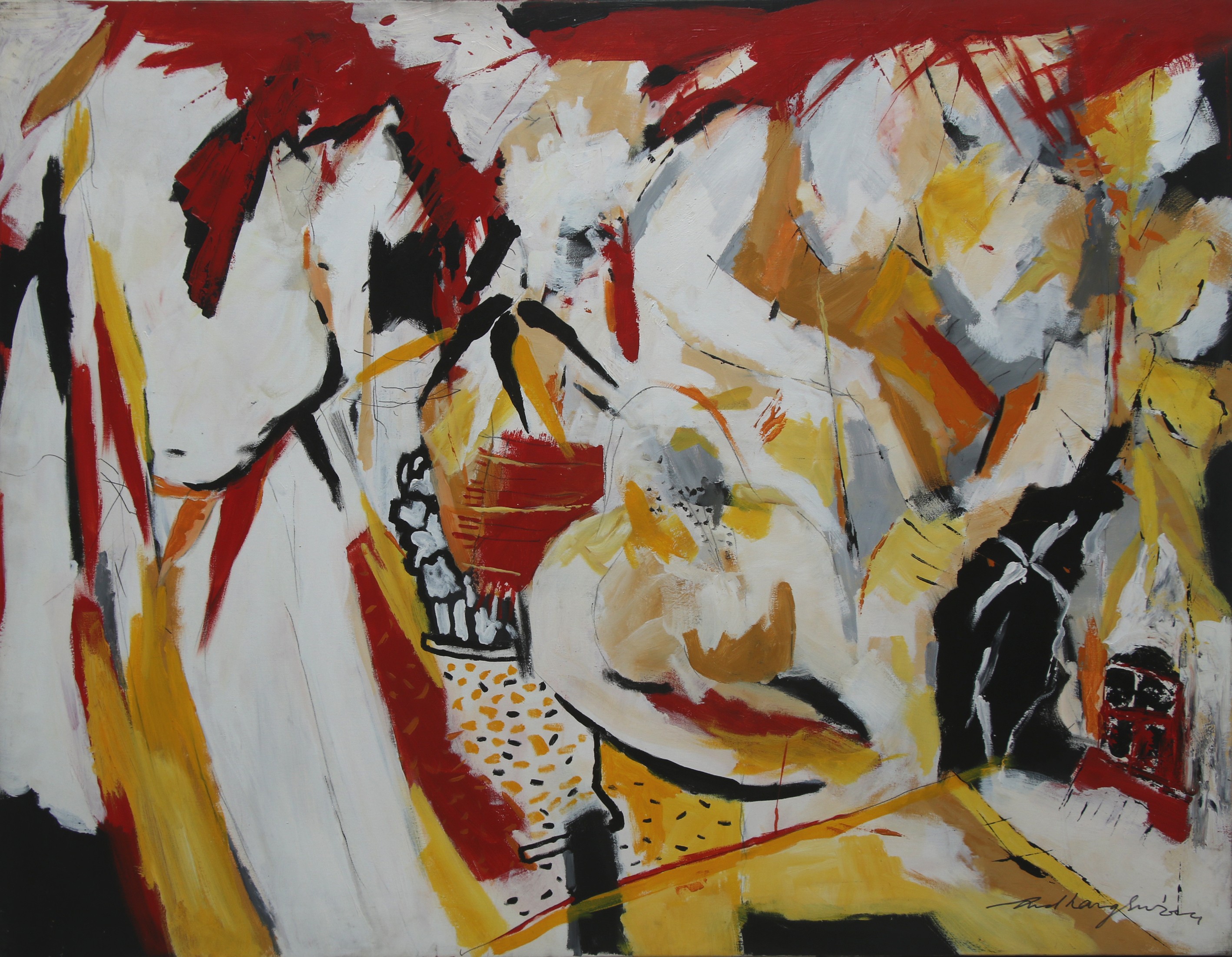 His artworks feature densely applied pigments—rich reds, subtle blues, and chrome yellow—that transition into deep, black-brown sections, creating unexpected hollows within the canvas. These areas suggest structures hidden beneath a flowing wave of subdued white, generating a striking contrast of colours and absence. He has been working in various mediums, like watercolour, lithography, oils, acrylics, pastels pens and inks. He is famous for using strong colours like red and black, which he makes very vibrant and full of emotion. His art mixes different things—feelings, ideas, and illusions—that might seem unclear at first but gradually capture and express his strong and calm feelings. He always creates patch work in his artworks.