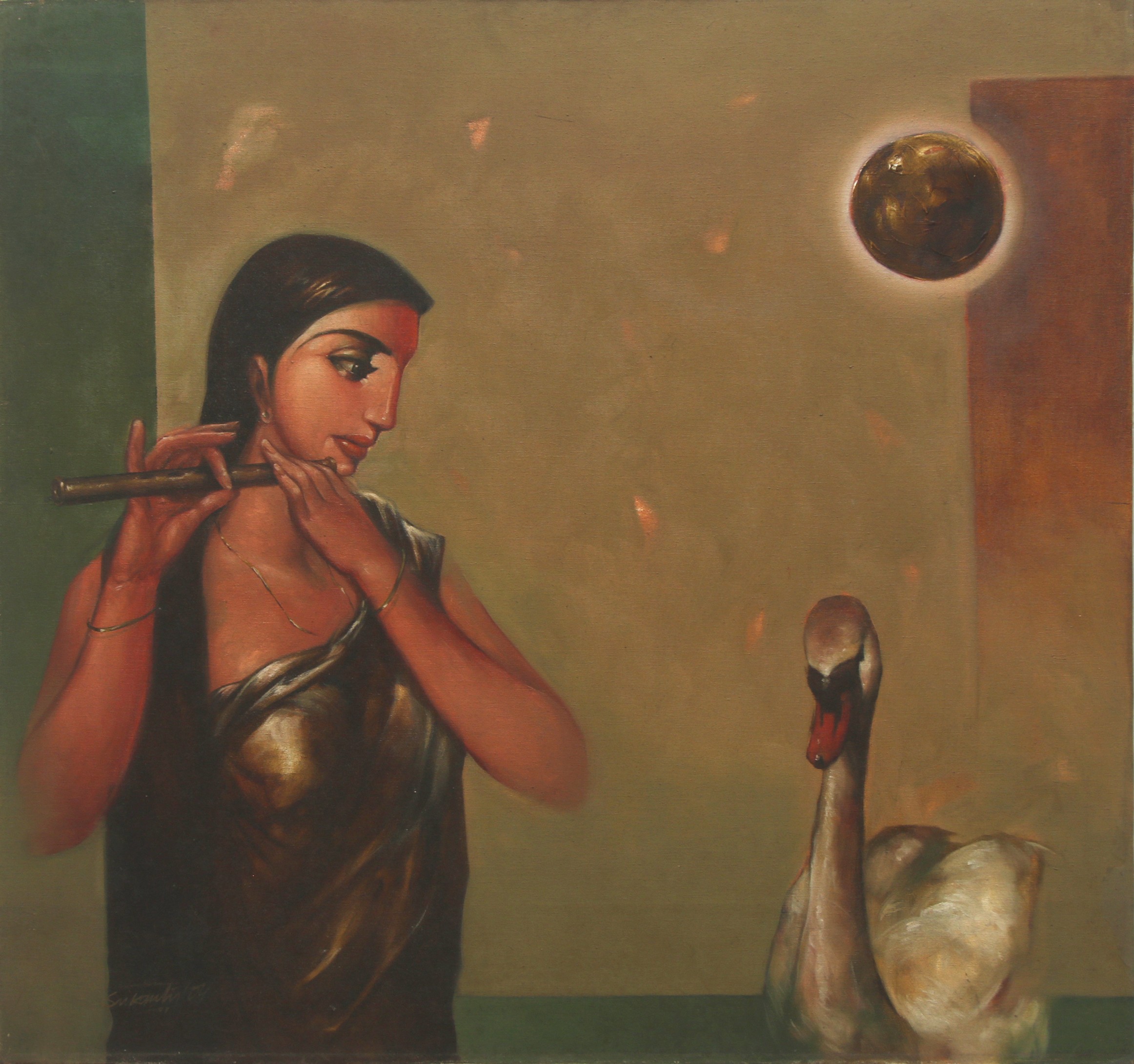 Das uses acrylics and mixed media on canvas to adeptly convey emotions through his art. His figures are striking, prompting viewers to envision narratives about the women depicted. Notice the intricate detail in their clothing and the artwork adorning them. Inspired by Mughal miniatures, his crafts captivating portraits that resonate with distant histories or tales.